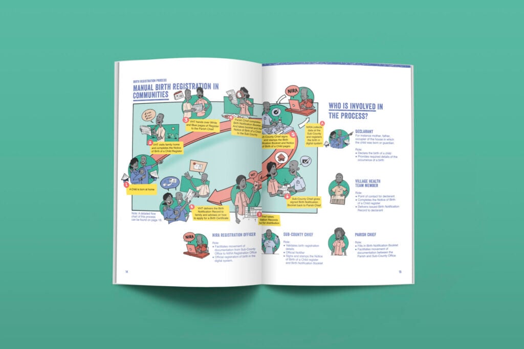 Handbooks The Handbooks were easy-to-use tools to support the Ugandan government and other organizations in implementing the birth registration models. It described the step-by-step illustrated process with tips and tricks for the key actors in implementation based on the lessons learnt from the evaluation. The Handbooks can be used as a resource to train implementing staff members and support them in their day-to-day work to implement the models.